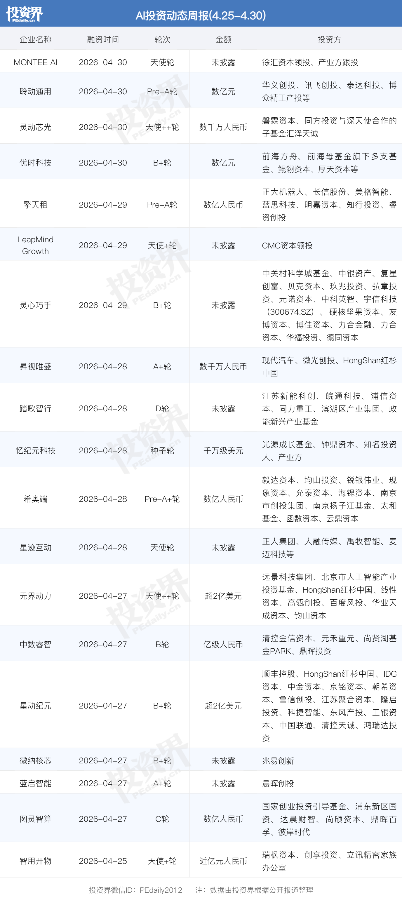 聆动通用机器人 数亿元 具身智能机器人投资方:华义创投,讯飞创投,泰达科投,博众精工产投等