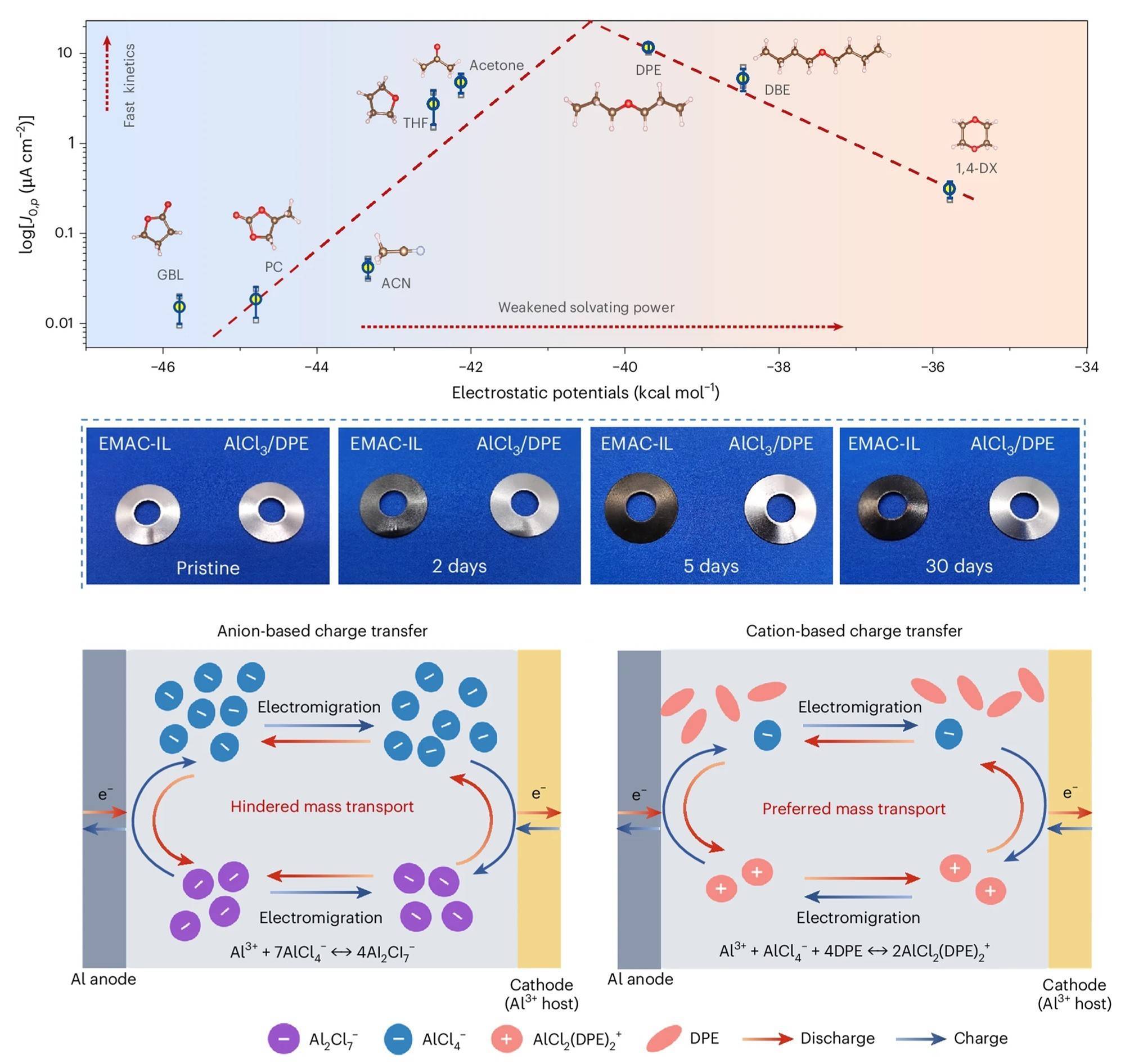 “有机双氯”电解液设计及特性图示。(受访单位供图)项目团队开创性提出“有机双氯”溶剂化电解液设计策略,以氯化铝/正丙醚有机体系替代传统离子液体,通过精确调控溶剂化结构,将腐蚀性氯离子“限域”在铝离子周围,显著降低腐蚀性的同时提升电化学可逆性。